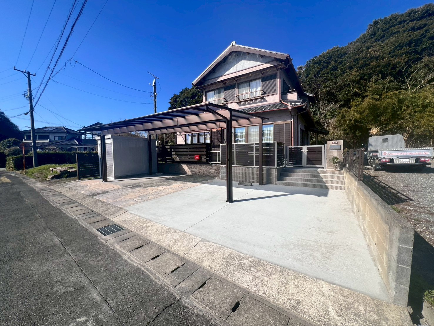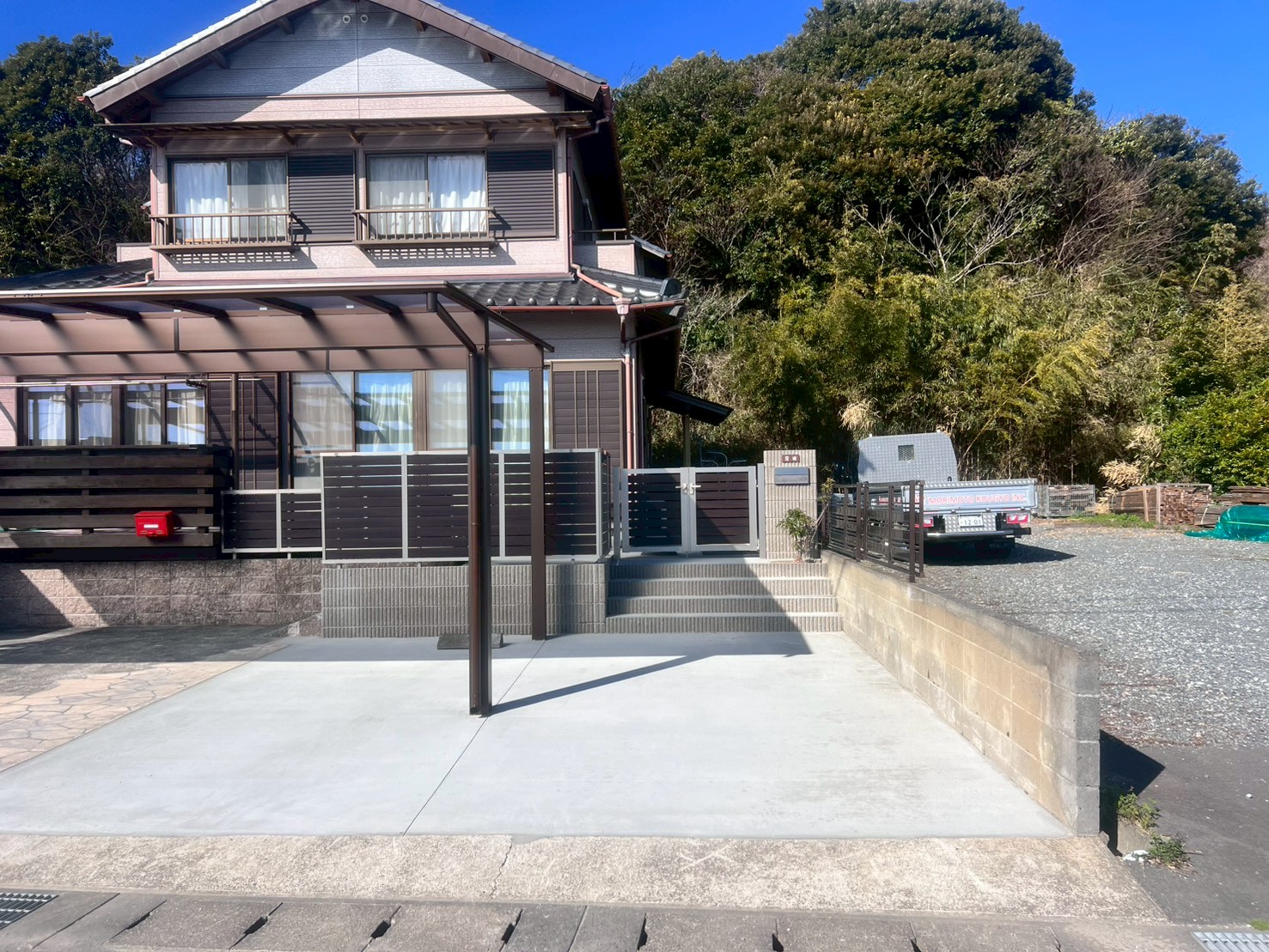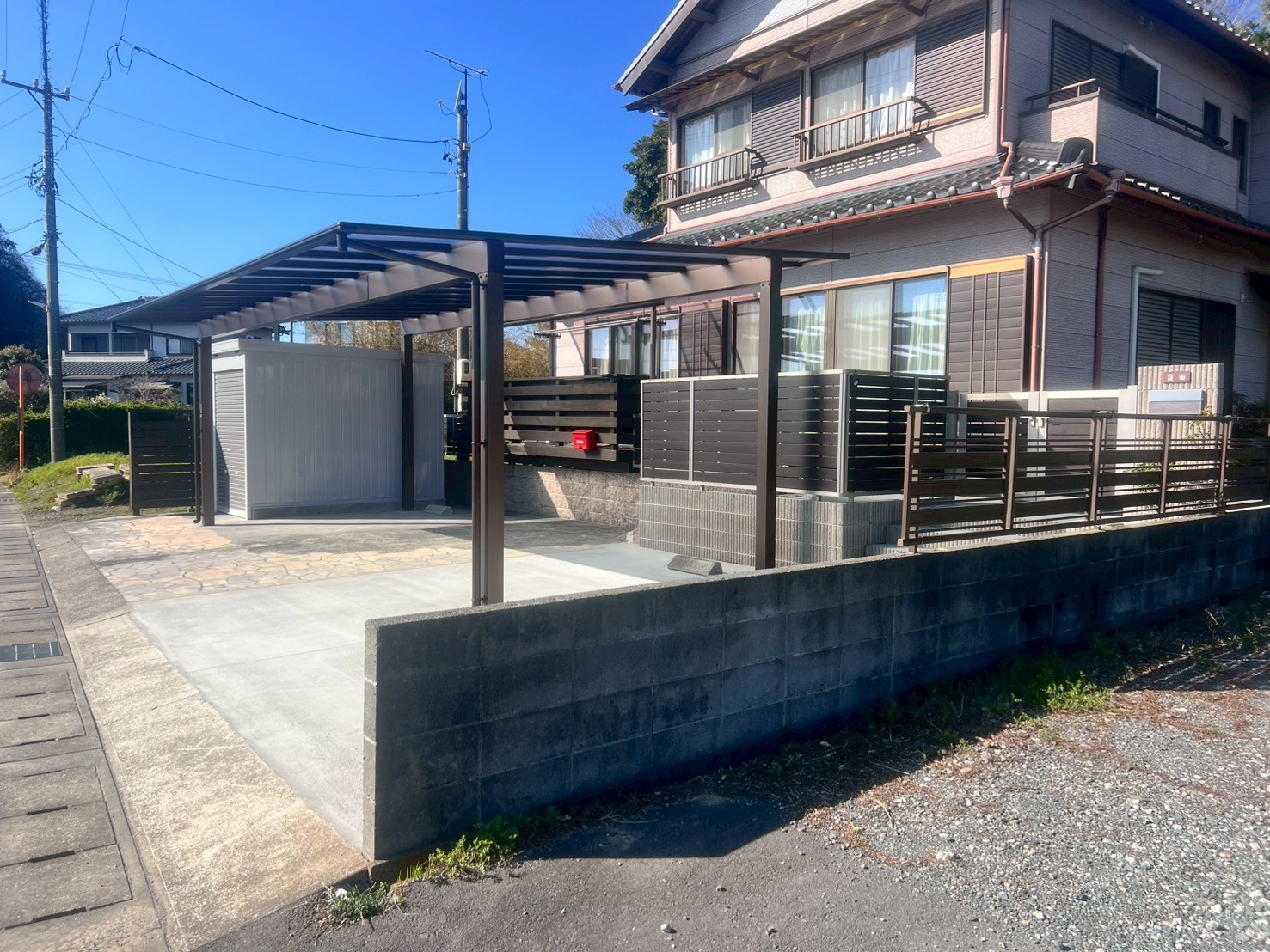 家族の成長に合わせて、伝統的なアプローチを機能的な駐車スペースへ。 バイク保管庫も備えたすっきりとした外観コーディネートで、住まいの価値を高める設計をご提案し、施工致しました。